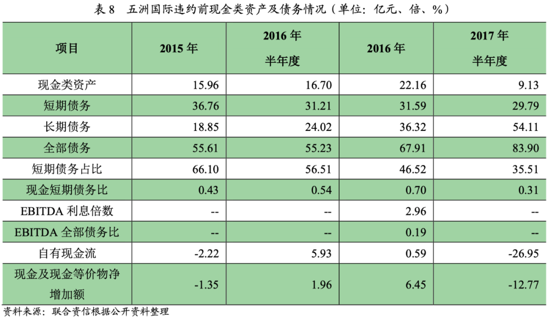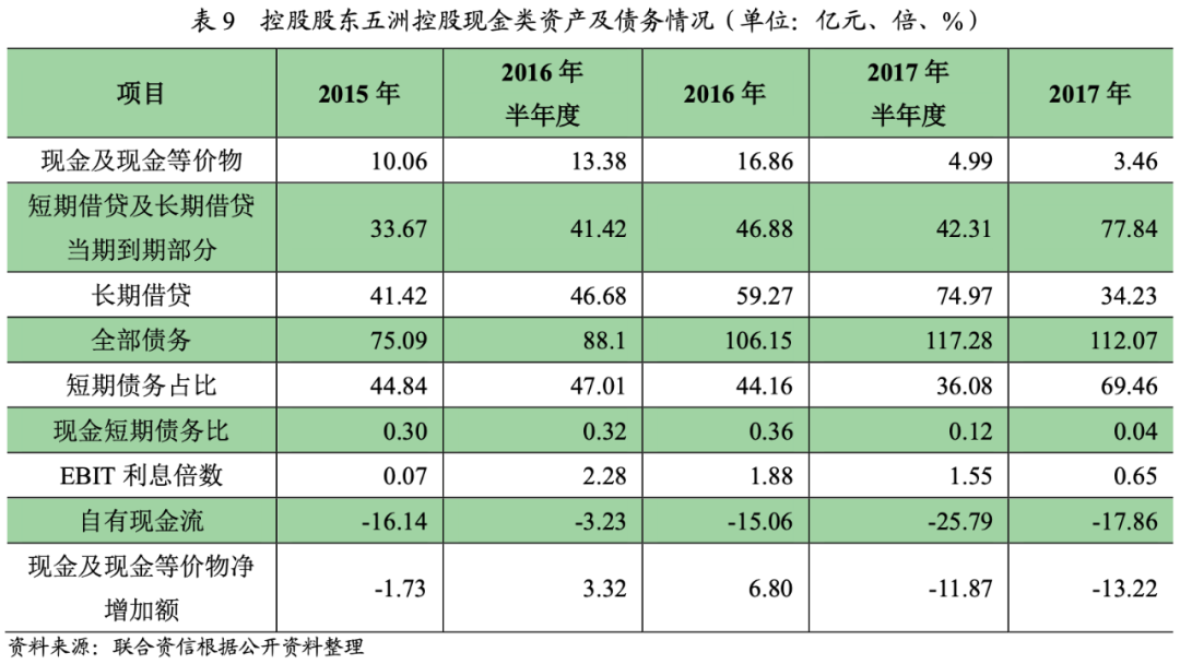 2018年7月5日,五洲控股已發(fā)生債務(wù)違約,控股股東雖然為五洲國(guó)際債務(wù)提供擔(dān)保,但自身收入下滑,盈利虧損,經(jīng)營(yíng)活動(dòng)現(xiàn)金流量?jī)纛~持續(xù)為負(fù),自身償債能力不足,對(duì)五洲國(guó)際債務(wù)已無(wú)擔(dān)保能力。