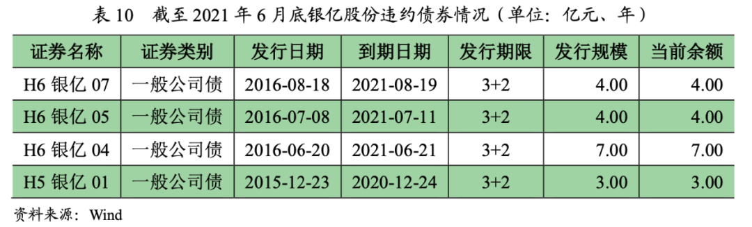截至2021年6月底,銀億股份存續(xù)4只債券均已發(fā)生實(shí)質(zhì)性違約,累計(jì)金額18.00億元。債券均設(shè)有回售條款,其中“H5銀億01”在回售日(2018年12月24日)因無(wú)法按時(shí)兌付本息發(fā)生實(shí)質(zhì)性違約,后其他存量債券相繼發(fā)生違約。