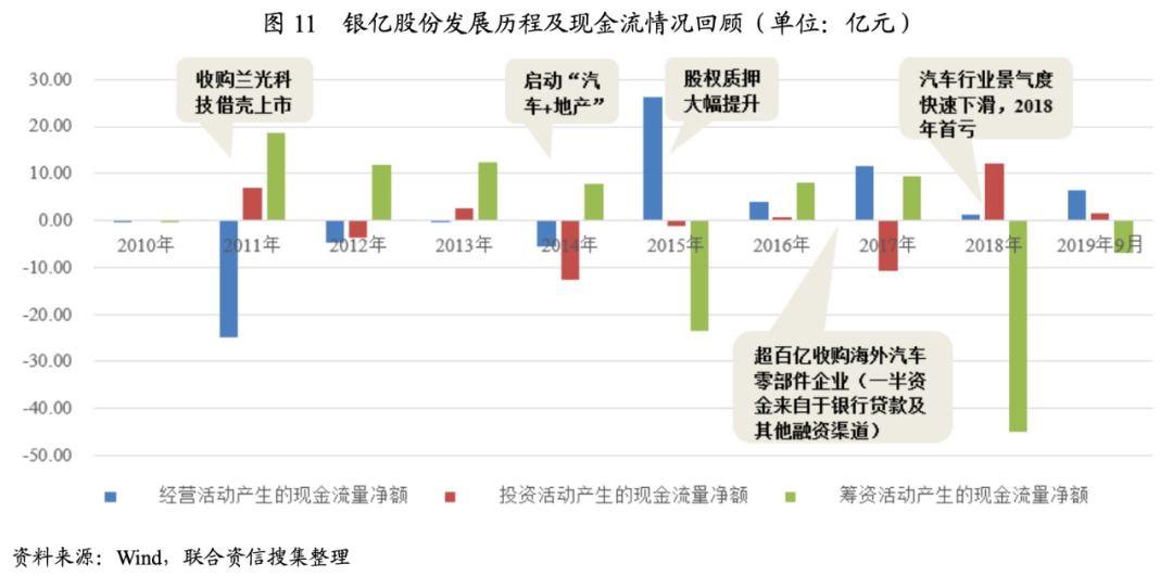 我們將銀億股份戰(zhàn)略轉(zhuǎn)型的時(shí)間節(jié)點(diǎn)和現(xiàn)金流情況進(jìn)行對(duì)比,回顧其發(fā)展歷程我們可以發(fā)現(xiàn):公司自2014年開(kāi)始啟動(dòng)“汽車(chē)+地產(chǎn)”的多元化策略,2015年開(kāi)始進(jìn)行大量股權(quán)質(zhì)押以應(yīng)對(duì)2016年開(kāi)始的大額海外汽車(chē)零部件企業(yè)收并購(gòu)舉動(dòng);但公司錯(cuò)過(guò)了地產(chǎn)的快速發(fā)展期,并在大額投入后迎來(lái)了汽車(chē)行業(yè)的快速下滑,并于2018年出現(xiàn)首虧,當(dāng)年融資能力快速下滑,爆發(fā)債務(wù)違約危機(jī),具體情況如下圖所示。