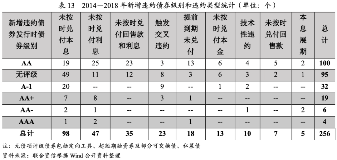各年份違約主體違約前信用評(píng)級(jí)呈現(xiàn)明顯的遷移態(tài)勢(shì),2014年違約主體的信用評(píng)級(jí)較低,或無(wú)信用評(píng)級(jí),隨后違約主體信用級(jí)別逐漸升高和分散化,直至2017年,級(jí)別最高的違約債券違約前主體信用評(píng)級(jí)提高至AA+,2018年,幾乎各個(gè)級(jí)別都出現(xiàn)了違約情況。