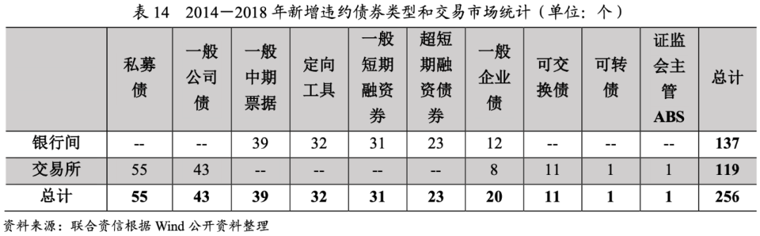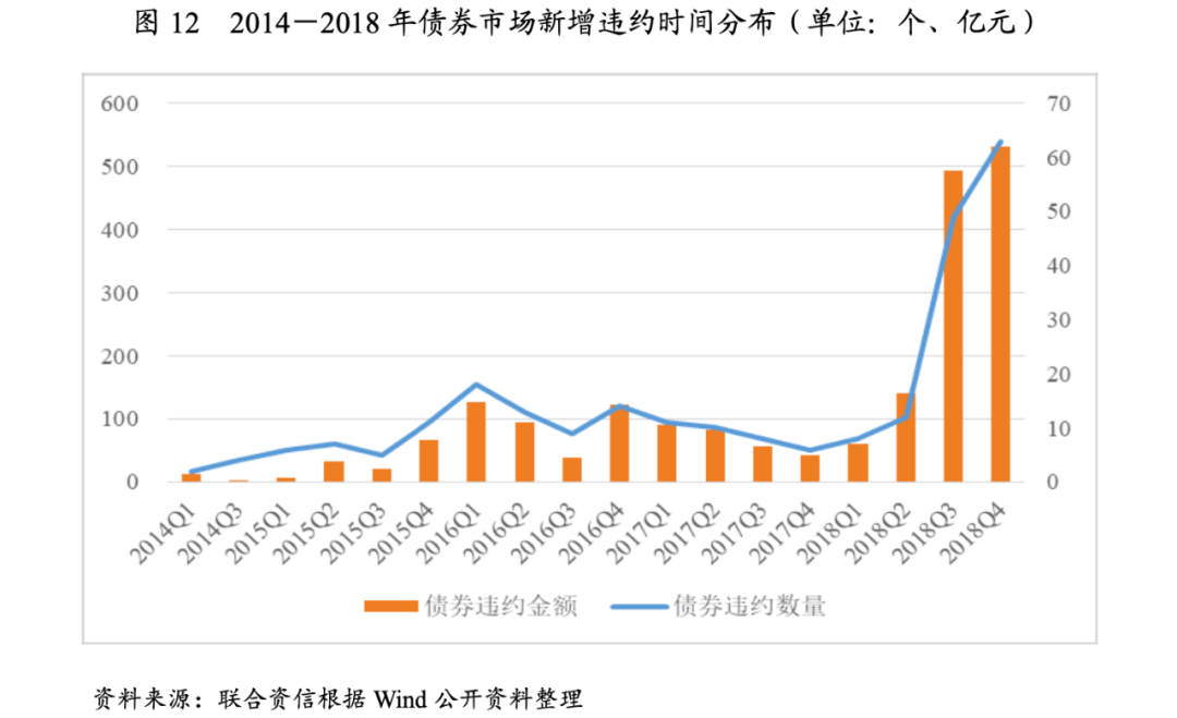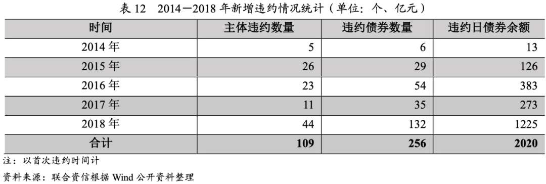 自2014年1月1日至2018年12月31日,交易所和銀行間市場(chǎng)共計(jì)109個(gè)主體違約,涉及256只債券,違約主體數(shù)量和違約日債券余額整體呈波動(dòng)增長(zhǎng)態(tài)勢(shì),其中2017年由于產(chǎn)能過(guò)剩、行業(yè)盈利和融資環(huán)境好轉(zhuǎn),新增違約情況有所下降,2018年由于外部信用環(huán)境收縮,債券市場(chǎng)違約數(shù)量和涉及的債券規(guī)模遠(yuǎn)超往年,且單個(gè)違約發(fā)行人涉及的債券規(guī)模高。