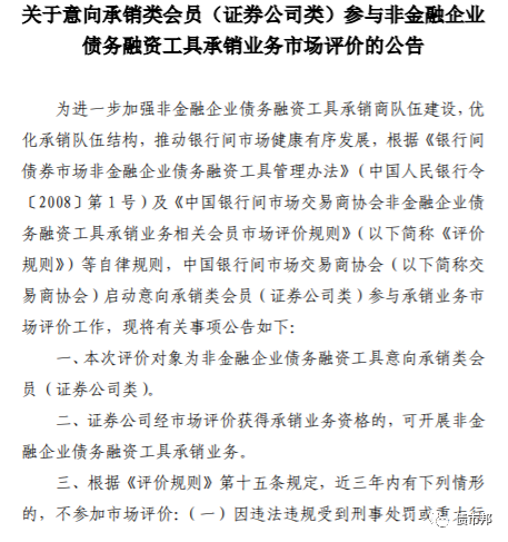 剛剛,協(xié)會(huì)網(wǎng)站又公布了《關(guān)于意向承銷類會(huì)員(證券公司類)參與非金融企業(yè)債務(wù)融資工具承銷業(yè)務(wù)市場(chǎng)評(píng)價(jià)的公告》,根據(jù)公告內(nèi)容,協(xié)會(huì)未來(lái)將根據(jù)證券公司債券業(yè)務(wù)開(kāi)展情況,進(jìn)一步對(duì)證券公司主承進(jìn)行擴(kuò)容。