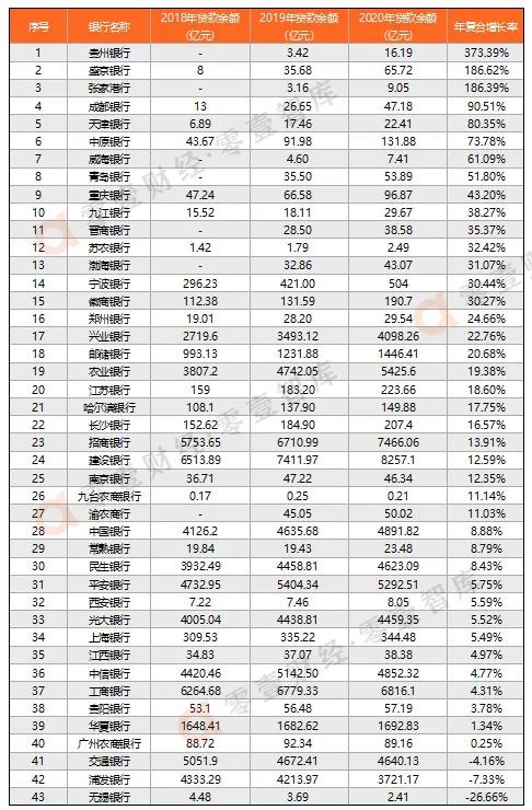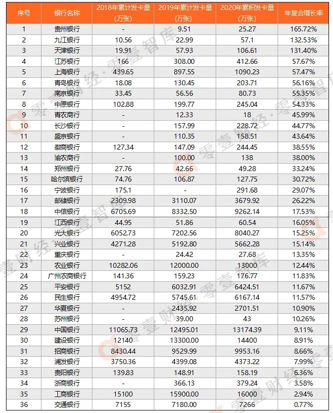 1、該圖表以各銀行相關(guān)指標(biāo)降序排列2、該圖有兩部分組成,橙色是以“累計(jì)發(fā)行量”這一口徑進(jìn)行對(duì)比,而灰色部分各銀行披露口徑不一,其中招商銀行、平安銀行、浦發(fā)銀行是以“信用卡流通量”進(jìn)行披露、交通銀行使用的是“在冊(cè)卡量”、郵儲(chǔ)銀行使用的是“結(jié)存卡量”,所以對(duì)該5家銀行進(jìn)行統(tǒng)一比較。數(shù)據(jù)來(lái)源:銀行年報(bào)、零壹智庫(kù)從信用卡發(fā)卡規(guī)模上來(lái)看,國(guó)有大行以及各個(gè)股份制銀行具有絕對(duì)的優(yōu)勢(shì),其中工商銀行以1.6億張累計(jì)發(fā)卡數(shù)量排名第一,建設(shè)銀行、中國(guó)銀行、農(nóng)業(yè)銀行累計(jì)發(fā)卡均過(guò)億(招商銀行由于統(tǒng)計(jì)的是流通量,其累計(jì)量估計(jì)也過(guò)億)。在股份制銀行中,浙商銀行和渤海銀行排名相對(duì)靠后。值得注意的是,上海銀行信用卡規(guī)模有著不錯(cuò)的表現(xiàn),也是唯一一家信用卡累計(jì)發(fā)行量超過(guò)千萬(wàn)的城商行。2、信用卡累計(jì)發(fā)卡增長(zhǎng)情況通過(guò)整理各銀行2018年至2020年累計(jì)發(fā)卡數(shù),分析近三年增長(zhǎng)情況。在已披露累計(jì)發(fā)卡量的40家銀行中,威海銀行、渤海銀行、無(wú)錫銀行未披露2018年和2019年的數(shù)據(jù),甘肅銀行雖然披露了2019年數(shù)據(jù),但其信用卡在2019年年中才首發(fā),所以增長(zhǎng)率不具有真實(shí)性,以上4家銀行均剔除,最終得到36家銀行近三年累計(jì)發(fā)卡增長(zhǎng)情況,具體數(shù)據(jù)如下表:表3 2018-2020年各銀行信用卡累計(jì)發(fā)卡增長(zhǎng)情況1、表中銀行是以年復(fù)合增長(zhǎng)率數(shù)據(jù)降序排列。2、若未披露2018年的數(shù)據(jù),則復(fù)合增長(zhǎng)率以2019年和2020年同比增長(zhǎng)率近似代替。3、青島銀行雖然有2018年數(shù)據(jù),但是其銀行卡在2018年9月首發(fā),計(jì)算復(fù)合增長(zhǎng)率真實(shí)性較差,所以使用的是2019年和2020年數(shù)據(jù)計(jì)算。4、招商銀行、交通銀行、平安銀行、浦發(fā)銀行、郵儲(chǔ)銀行的增長(zhǎng)率是基于“信用卡流通量”這一口徑計(jì)算出的估計(jì)值,有一定的誤差。數(shù)據(jù)來(lái)源:銀行年報(bào)、零壹智庫(kù)在信用卡累計(jì)量的增速上,城商行具有絕對(duì)的優(yōu)勢(shì),前十名中有九家銀行為城商行,一家為農(nóng)商行(青農(nóng)商行),有三家年復(fù)合增長(zhǎng)率超過(guò)100%,分別是貴州銀行的165.72%、九江銀行的132.53%和天津銀行的131.4%。而國(guó)有大行和股份制銀行在增速上則相對(duì)較緩慢,國(guó)有大行中最高的為郵儲(chǔ)銀行的26.22%,股份制商業(yè)銀行最高的為中信銀行的17.53%。主要原因是,股份制銀行業(yè)國(guó)有大行的信用卡業(yè)務(wù)相對(duì)已經(jīng)成熟,在信用卡存量上已經(jīng)達(dá)到了一定的瓶頸,另一方面其基數(shù)較大增速必定有限,此外城商行近幾年在信用卡業(yè)務(wù)持續(xù)發(fā)力,使其增長(zhǎng)迅速。整體來(lái)看,上市銀行對(duì)發(fā)放信用卡貸款的態(tài)度較為積極,2020年底多數(shù)銀行都達(dá)到了上千億的貸款余額規(guī)模。通過(guò)分析各家銀行的信用卡貸款余額則能夠反映出各銀行信用卡貸款規(guī)模情況,進(jìn)一步說(shuō)明銀行的借貸規(guī)模更大。2020年在54家銀行中共有46家披露了自家信用卡貸款余額的情況,具體數(shù)據(jù)與排名情況如下: