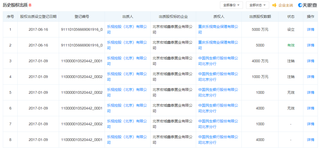 2016年,樂(lè)視大廈被作為地產(chǎn)資產(chǎn)拿去質(zhì)押,從浙江中泰創(chuàng)展企業(yè)管理有限公司(下稱“中泰創(chuàng)展”)處換取了14億元融資,期限為兩年,年利率8%;2017年,樂(lè)視大廈的股權(quán)還曾被質(zhì)押給重慶樂(lè)視商業(yè)保理有限公司、中國(guó)民生銀行股份有限公司北京分行。
