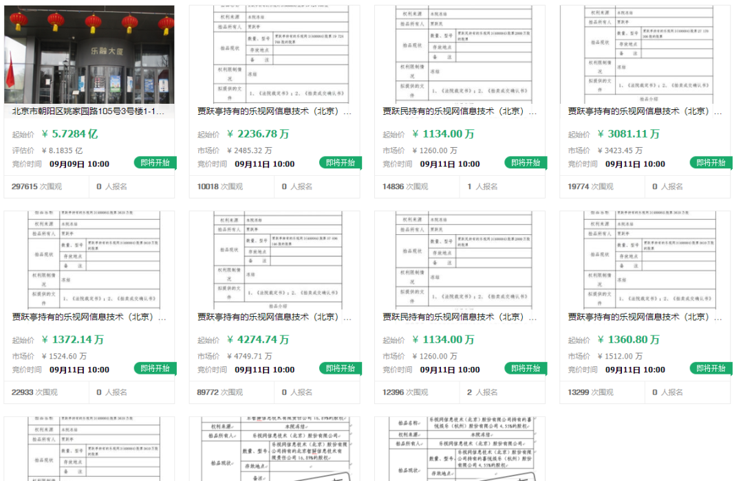 緊隨其后即將在9月11日拍賣的,是賈躍亭持有樂(lè)視網(wǎng)信息技術(shù)(北京)股份有限公司(原樂(lè)視網(wǎng)退市后到三板市場(chǎng)交易,下稱“樂(lè)視網(wǎng)3”)約1.2億股的股票和其哥哥賈躍民所持有的樂(lè)視網(wǎng)3總計(jì)2000萬(wàn)股的股票,起拍價(jià)合計(jì)超1.59億元。