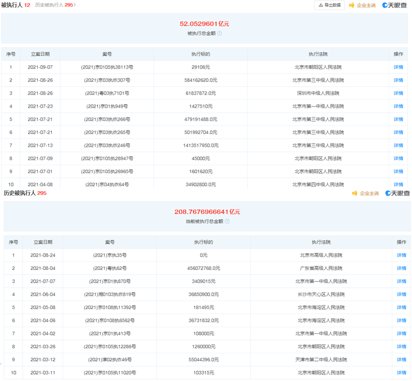 另?yè)?jù)天眼查,樂(lè)視控股僅2021年的被執(zhí)行總金額就超38億元,公司總計(jì)擁有307條被執(zhí)行人信息,歷史上總計(jì)被出具238條限制消費(fèi)令;賈躍亭2021年的被執(zhí)行總金額則超67億元。