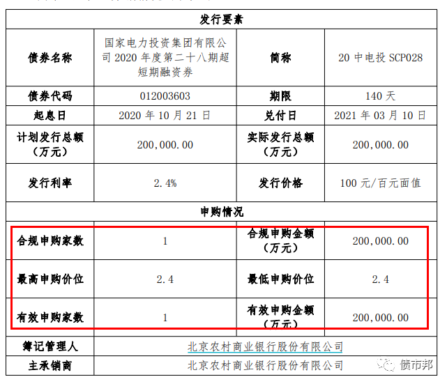 再來看看包銷發(fā)行的優(yōu)質(zhì)發(fā)行人發(fā)行場面,冷冷清清凄凄慘慘戚戚,發(fā)20億元,只有1個申購人,1個申購價位,1倍的全場倍數(shù)。