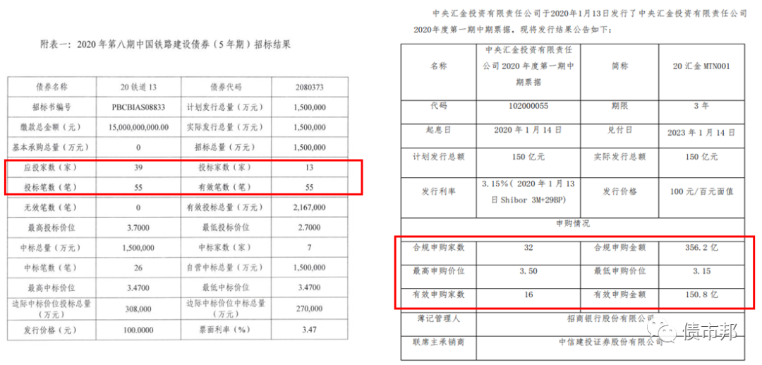 我們來看一下,堅持市場化發(fā)行的優(yōu)質(zhì)發(fā)行人——中國國家鐵路集團和中央?yún)R金公司的發(fā)行結果公告,每次發(fā)行的有效申購家數(shù)都能超過10家。看著這數(shù)字,隔著屏幕都能感覺到鑼鼓喧天熱鬧非凡的發(fā)行場面。
