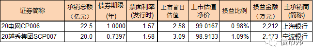 下面舉個例子,20電網(wǎng)CP0006,票面利率1.57%,但是實際市場估值是2.58%,因為票面利率要低于市場估值,按照現(xiàn)金流貼現(xiàn)的計算公式,債券上市首日凈價99.016元低于100元的面值,主承銀行付出的機會成本大約為2212萬元(22.5億×0.98%)。