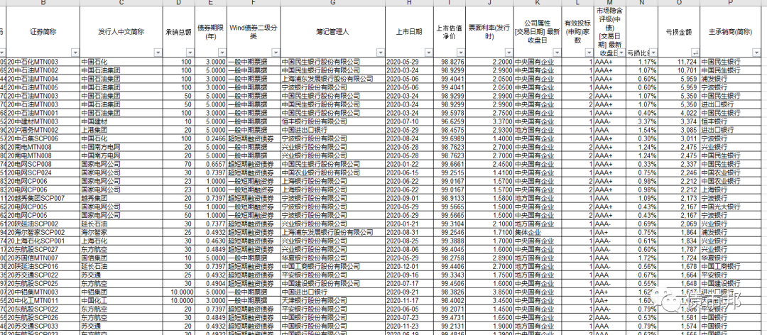 基于前文所說的的包銷券鑒定和包銷機會成本測算,阿邦篩選了2020年1月1日至12月10日的公開發(fā)行的NAMFII公司信用類債券的包銷券,進行了損益的統(tǒng)計分析。