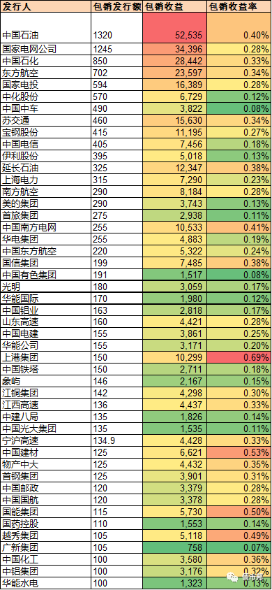 從包銷獲取的收益來看,沒錯,這里用的詞是收益,彼之砒霜吾之蜜糖,作為兩個博弈主體,主承付出的成本就是發(fā)行人獲取的收益。排名前五的發(fā)行人是中石油(52535萬)、國家電網(wǎng)(34396萬)、中石化(28442萬)、東方航空(23597萬)和國電投(16389萬)。