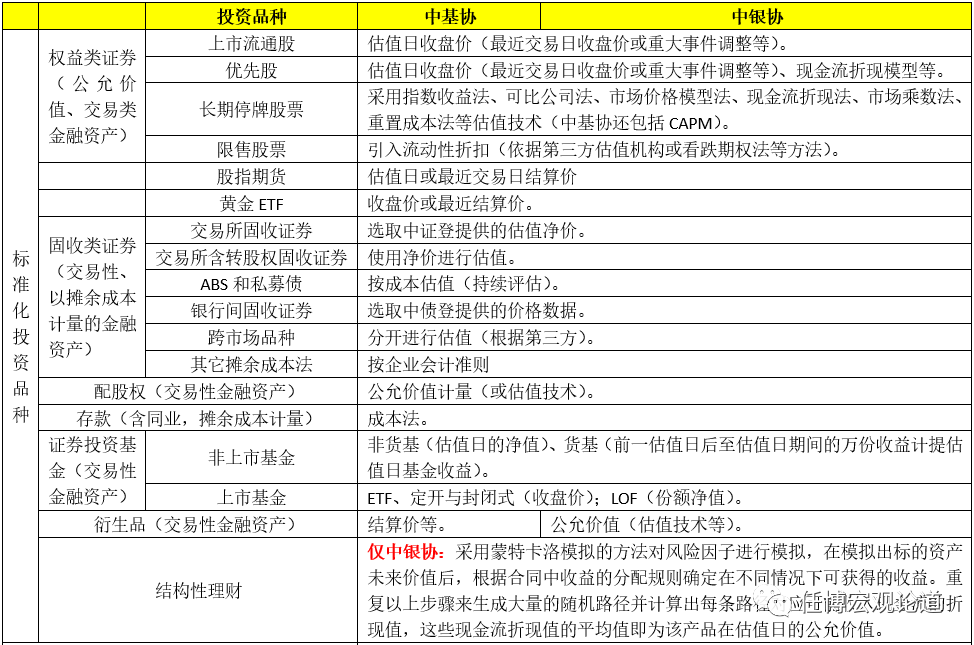 二、中基協(xié)與中銀協(xié)關(guān)于資管投資品種估值標(biāo)準(zhǔn)的對比