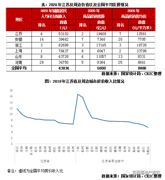 全國第二大商品房市場,2019年數(shù)據(jù)顯示近8成城市房價(jià)收入比低于全國平均。2020年,江蘇省商品房銷售總額高達(dá)1.94萬億元,占全國商品房銷售額的11.2%,僅次于廣東省,居于全國第2位。全省城鎮(zhèn)居民人均可支配收入為53102元,遠(yuǎn)高于全國平均的43834元,在全國31個(gè)省和自治區(qū)中排名第4,而2020年江蘇省商品房銷售均價(jià)僅為12581元/平方米,排名全國第7。從居民購買力來看,江蘇房地產(chǎn)市場支撐強(qiáng)勁。具體城市而言,以2019年數(shù)據(jù)為例,江蘇省內(nèi)除了蘇州、南京以及無錫外,其他10個(gè)城市的房價(jià)收入比均低于全國平均水平。
