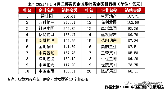 隨著外來房企的入駐和持續(xù)擴(kuò)張,本土房企的生存空間受到了擠壓。從2021年1-4月江蘇省房企流量銷售金額排行榜來看,基本是全國性品牌房企的天下,碧桂園、萬科地產(chǎn)、融創(chuàng)中國包攬榜單前三位,也是1-4月份僅有的3個(gè)銷售業(yè)績超兩百億的房企。反觀蘇系本土房企,進(jìn)入榜單20強(qiáng)的只有中南、新城和弘陽三家,且他們都在上海設(shè)有總部,正著力進(jìn)行大跨度的全國擴(kuò)張。此外,新城和中南雖保住了前十的地位,但相比碧桂園只有不到一半的銷售業(yè)績。