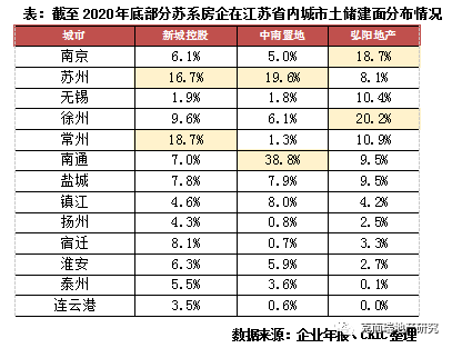 省內(nèi)城市布局完善,但投資力度各有側(cè)重。新城、中南和弘陽在江蘇省內(nèi)的布局最為完善,但從總土儲建筑面積的分布上來看,各城市投資力度也有所差異,截止2020年底土儲分布并非均勻,呈現(xiàn)出了向其中部分城市傾斜的狀態(tài),土儲占比大于15%的城市均只有兩家。中南置地的土儲建面近4成集中在大本營南通,其次是占比19.6%的蘇州,其余城市的占比不足10%,無錫、常州、揚(yáng)州、宿遷和連云港的土儲建面占比則只有1%左右。新城控股的土儲主要集中在大本營常州,占比達(dá)18.7%,蘇州土儲占比不相上下。對弘陽而言,本就有56%的總土儲建面位于江蘇省內(nèi),這部分土儲大部分位于徐州和南京,大本營南京并非占比最高的城市,而是徐州,占比約20%。說明即使省內(nèi)實(shí)現(xiàn)了全覆蓋,但仍有所倚重,重倉之地除了大本營外,還搭配有另一座城市,如蘇州和徐州。考慮到外拓省外市場的風(fēng)險(xiǎn),尤其當(dāng)前整個(gè)長三角市場熱度較高,我們判斷蘇系房企將持續(xù)深耕省內(nèi),擴(kuò)大省內(nèi)其他城市的土儲規(guī)模。