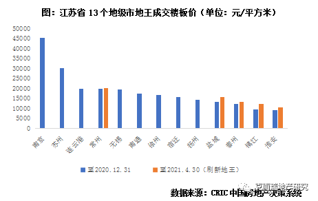 土拍市場競爭激烈,地王頻出,地價(jià)交替激增。由于品牌開發(fā)商較早進(jìn)駐,近年來又通過限地價(jià)穩(wěn)行情,據(jù)CRIC統(tǒng)計(jì),早在2016、2018年,南京和蘇州的地王樓板價(jià)就分別突破4.5萬/平方米和3萬/平方米,高于省內(nèi)其他城市,近兩年熱度不減,仍有德信、大家等中小房企涌入。同時(shí),至2020年4月30日,連云港、常州、無錫三個(gè)城市的地王樓板價(jià)也即將突破2萬元大關(guān),特別是無錫,在不久前結(jié)束的首次集中供地中,成交16宗地塊有12宗都被50強(qiáng)房企拿下,平均可比地價(jià)上漲30%以上。一方面由于棚改需求釋放,另一方面由于外來開發(fā)商加速進(jìn)駐,其他城市的地價(jià)也出現(xiàn)了不同程度的上升,部分在2021年前四月刷新了原先的地王樓板價(jià)。以宿遷為例,2020年下半年開始地市明顯轉(zhuǎn)熱,幾乎每場土拍都有新的單價(jià)地王誕生。究其原因,主要是融創(chuàng)、綠城、正榮等品牌房企均在2020年進(jìn)入宿遷市場,土拍競爭越發(fā)激烈。如2020年12月末出讓的宿城16地塊經(jīng)歷了200余輪競拍才由建發(fā)競得,平均樓板價(jià)高達(dá)15600元/平方米,創(chuàng)下宿遷成交地價(jià)新高,而此前的單價(jià)地王宿城09地塊在當(dāng)年10月份拍賣時(shí)僅經(jīng)過了65輪競拍。