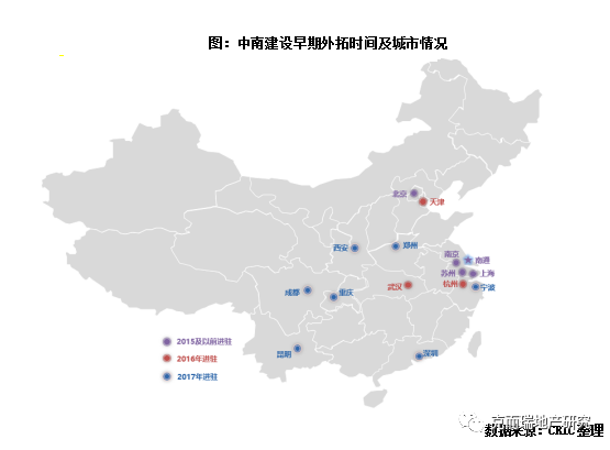 由于蘇系房企大本營多在人口和經(jīng)濟(jì)條件皆比較好的蘇南區(qū)域,因此借由區(qū)域紅利,多數(shù)房企在創(chuàng)始初期深耕本省或長三角區(qū)域,之后以長三角為中心逐步向外擴(kuò)張,并且早期外拓以市場容量更大,風(fēng)險(xiǎn)系數(shù)更小的高能級城市為主。以目前蘇系規(guī)模最為突出的新城控股和中南建設(shè)為例: