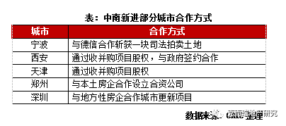 中南也普遍采用合作的方式進(jìn)駐新城,相較新城而言,中南的合作方式更加多樣。中南合作拓土模式代表城市有寧波、西安、深圳、天津、鄭州等,從其合作模式上來看,中南合作的方式非常多樣:像企業(yè)新進(jìn)寧波時(shí)是通過與德信合作斬獲一塊司法拍賣土地;新進(jìn)西安、天津是通過收并購項(xiàng)目股權(quán),之后在西安還通過與當(dāng)?shù)卣灱s合作進(jìn)一步擴(kuò)大業(yè)務(wù),涉及特色小鎮(zhèn)、城市更新以及PPP項(xiàng)目合作等多種類型,通過大規(guī)模合作,進(jìn)駐西安第二年中南銷售額即突破百億;而新進(jìn)鄭州則是通過與本土房企合作設(shè)立合資公司;新進(jìn)深圳則是通過與地方性房企合作城市更新項(xiàng)目。