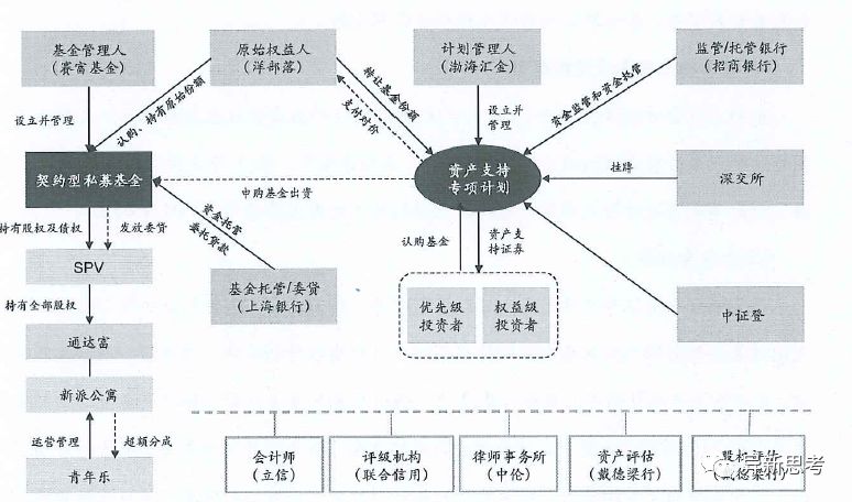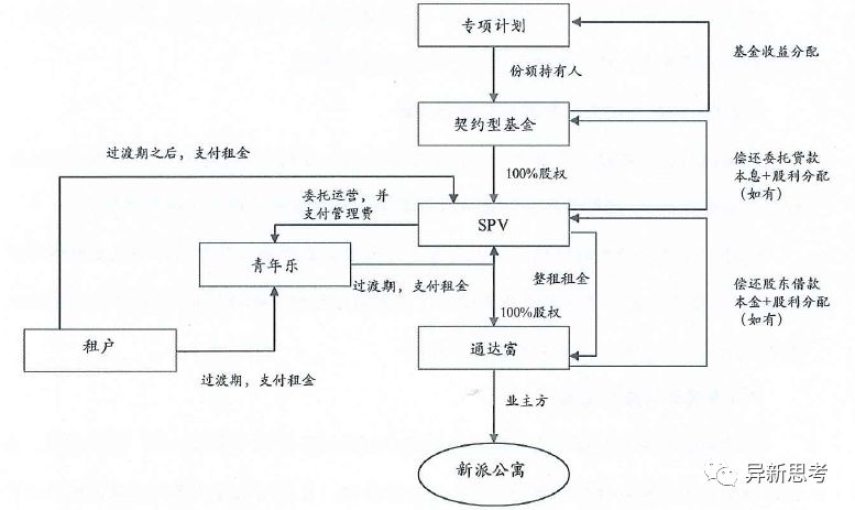 在搭建該類REITS結(jié)構(gòu)前的既有結(jié)構(gòu)中,青年樂為新派公寓的整租方和運(yùn)營方,即青年樂與通達(dá)富簽署《整租協(xié)議》,并定期向通達(dá)富支付租金,青年樂再將新派公寓轉(zhuǎn)租給租客,賺取租金差價(jià);在該交易結(jié)構(gòu)中,由SPV、通達(dá)富、青年樂簽署三方《委托管理協(xié)議》,期限5年,約定SPV承接青年樂的職能,從通達(dá)富整租新派CBD物業(yè)并對外分租,原青年樂和通達(dá)富的總租關(guān)系終止。SPV委派青年樂提供租賃運(yùn)營管理服務(wù),包括但不限于確定金水平、催收、日常管理物業(yè)改造等安排,青年樂業(yè)績激勵(lì)費(fèi)占當(dāng)年SPV的分租租金和綜合配套收入之和的【5】%,且青年樂承諾從2018年起,SPV每年可分配凈現(xiàn)金流不低于【800】萬/年(扣除青年樂的業(yè)績激勵(lì)費(fèi)之后);若SPV的可分配凈現(xiàn)金流不足上述標(biāo)準(zhǔn)的,青年樂承諾無條件不可撤銷地予以差額補(bǔ)足。