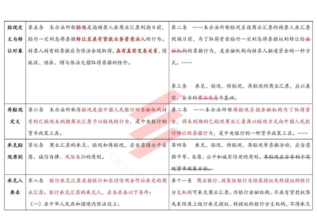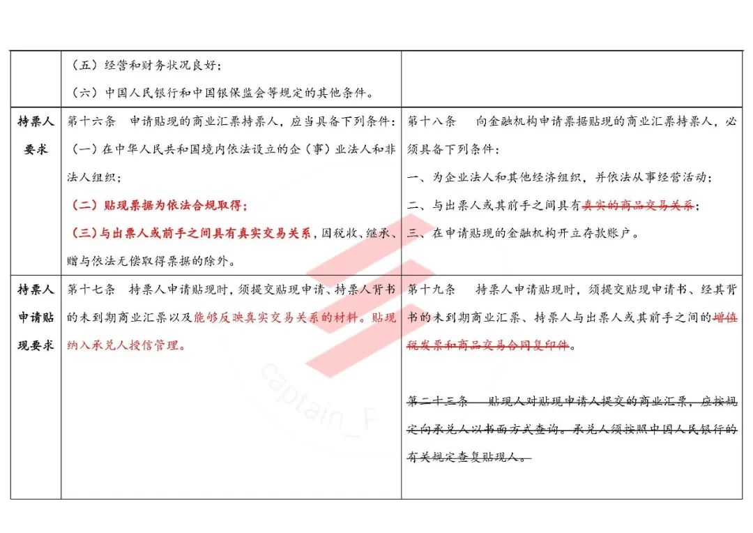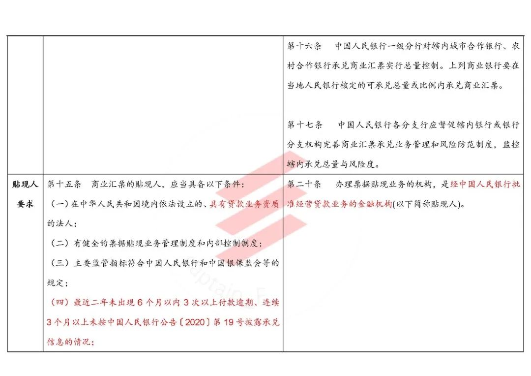 這里把原辦法“商品交易關(guān)系”,改為了與《票據(jù)法》相一致的“真實(shí)交易關(guān)系”,可謂是一個(gè)進(jìn)步。但關(guān)鍵是又提出了“能夠反映真實(shí)交易關(guān)系的材料”(原來(lái)1997年的文直接列舉了增值稅發(fā)票和商品交易合同復(fù)印件),實(shí)際上可能還提高了貼現(xiàn)機(jī)構(gòu)審查真實(shí)貿(mào)易背景的要求——其實(shí)后來(lái)的224號(hào)文之類的那套標(biāo)準(zhǔn)反而好用,因?yàn)楹苊鞔_,告訴你合同和發(fā)票看復(fù)印件就行啦、電子商務(wù)企業(yè)看電子訂單也可以啊。