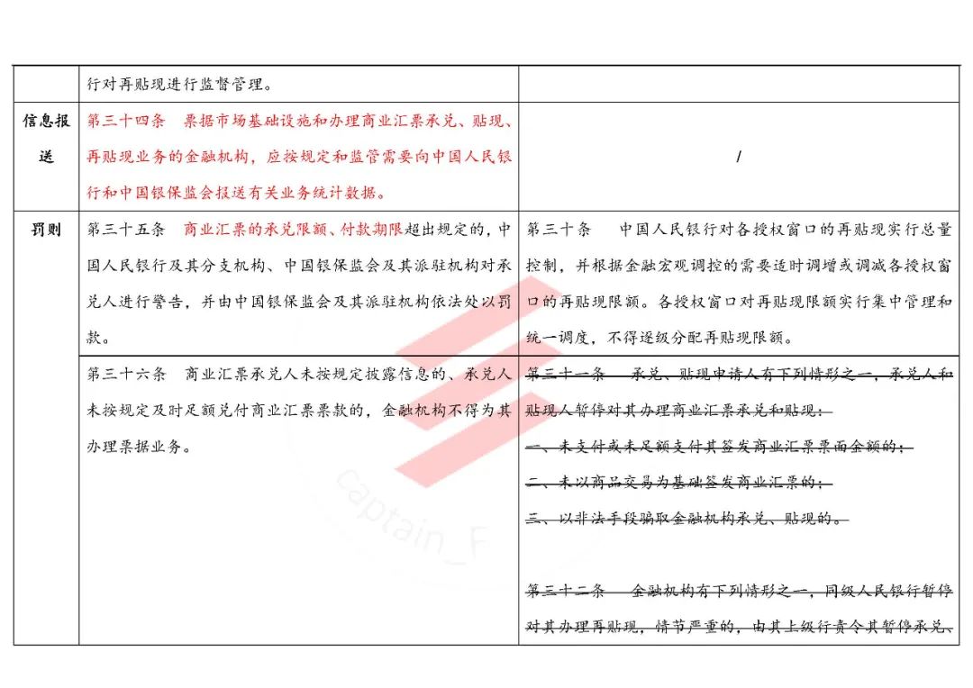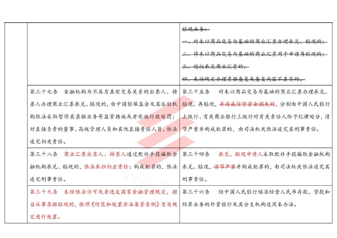 另外,細(xì)心的同學(xué)還發(fā)現(xiàn),第三十七條中,對(duì)于金融機(jī)構(gòu)為不具有真實(shí)交易關(guān)系的商票辦理貼現(xiàn),不再要求造成信貸資金損失,將直接面臨處罰。這意味著,融資票不復(fù)存在,金融機(jī)構(gòu)也不要幻想為了變相給核心企業(yè)放款,創(chuàng)造條件達(dá)到放款目的了。