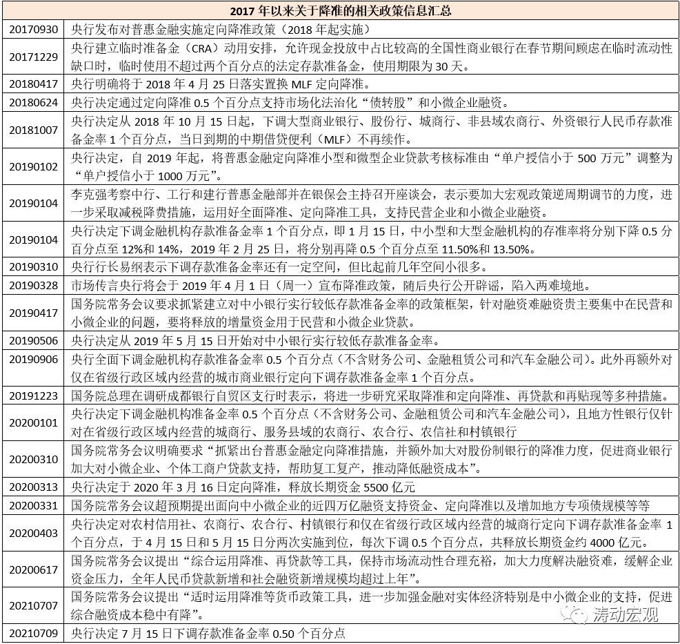 (七)2021年7月7日的國務院常務會議明確“針對大宗商品價格上漲對企業(yè)生產經營的影響,要在堅持不搞大水漫灌的基礎上,保持貨幣政策穩(wěn)定性、增強有效性,適時運用降準等貨幣政策工具,進一步加強金融對實體經濟特別是中小微企業(yè)的支持,促進綜合融資成本穩(wěn)中有降”。隨后2021年7月9日央行決定于2021年7月15日下調金融機構存款準備金率0.5個百分點(不含已執(zhí)行5%存款準備金率的金融機構)。