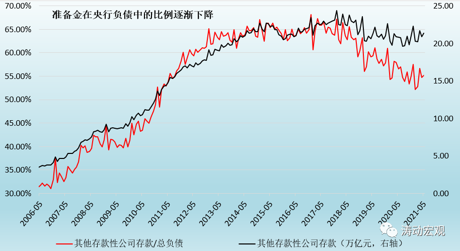 央行的負債主要由基礎貨幣(貨幣發(fā)行量+存款準備金)和政府存款兩大類構成,而存款準備金規(guī)模則由2017年底的24萬億以上降至目前的20萬億附近,占央行總負債的比例亦由過去65%以上降至目前的55%附近。隨著一般性存款余額的不斷增多,在準備金率不變的情況下,意味著存款準備金余額本身也在不斷上升,因此央行只有通過不斷降準才能對沖余額不斷增長的存款準備金,并通過此舉優(yōu)化央行的負債結構。