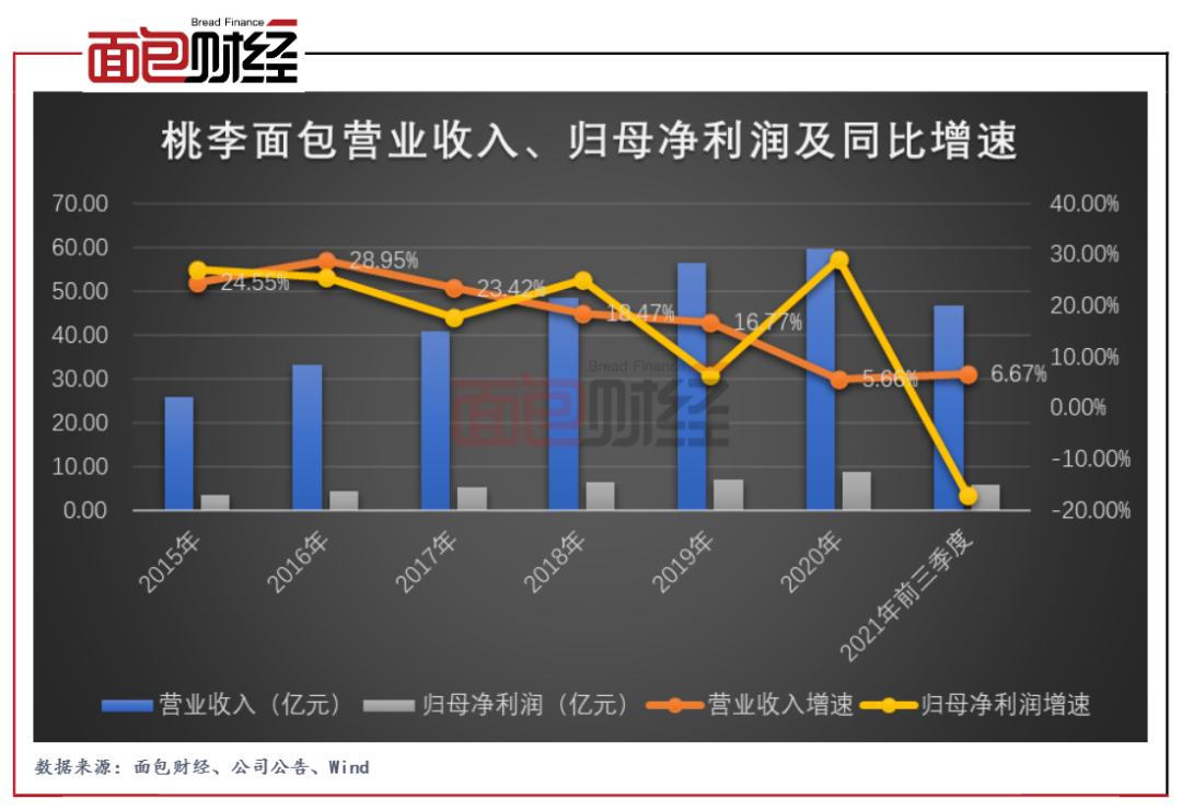 圖2:2015年至2021年前三季度桃李面包營業(yè)收入、歸母凈利潤及同比增速