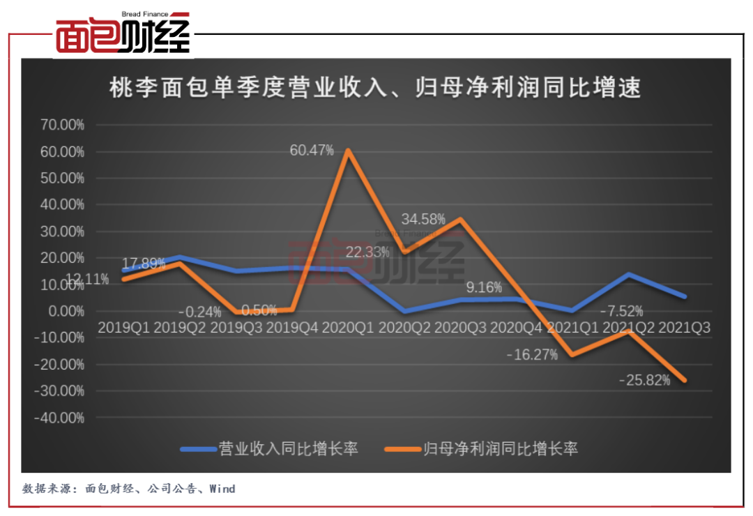圖3:2019Q1至2021Q3桃李面包單季度營業(yè)收入、歸母凈利潤同比增速