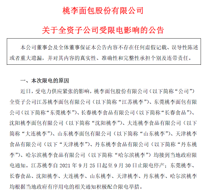 2021年9月底,桃李面包發(fā)布公告稱,近日受電力供應緊張的影響,公司旗下江蘇桃李、東莞桃李、長春食品等多家子公司均接到當?shù)卣揠娡ㄖ?/p>