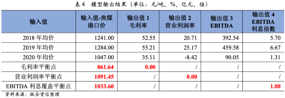 根據(jù)測算,若將2018-2020年焦煤港口價[3]輸入模型,2018年及2019年焦煤樣本企業(yè)營業(yè)利潤率指標(biāo)均表現(xiàn)良好,2020年營業(yè)利潤率指標(biāo)表現(xiàn)較差。當(dāng)焦煤港口價達(dá)到861.64元/噸時,則達(dá)到焦煤樣本企業(yè)毛利率的平衡點。當(dāng)焦煤港口價達(dá)到1033.60元/噸時,焦煤樣本企業(yè)的EBITDA剛好可覆蓋相關(guān)的利息支出。當(dāng)焦煤港口價為1091.45元/噸時,達(dá)到焦煤樣本企業(yè)營業(yè)利潤率的平衡點。