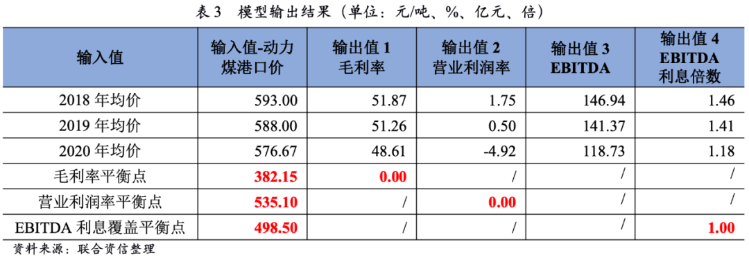 根據(jù)測算,若將2018-2020年秦皇島港口動力煤市場價全年均值輸入模型,毛利率指標(biāo)、EBITDA及EBITDA利息指標(biāo)均表現(xiàn)良好。若動力煤港口價下降至382.15元/噸,則達(dá)到動力煤樣本企業(yè)毛利率的平衡點,即動力煤樣本企業(yè)毛利率為0。當(dāng)動力煤港口價達(dá)到498.50元/噸時,動力煤樣本企業(yè)的EBITDA剛好可覆蓋相關(guān)的利息支出。當(dāng)動力煤港口價為535.10元/噸時,達(dá)到動力煤樣本企業(yè)營業(yè)利潤率的平衡點,即樣本企業(yè)的營業(yè)利潤率為0。