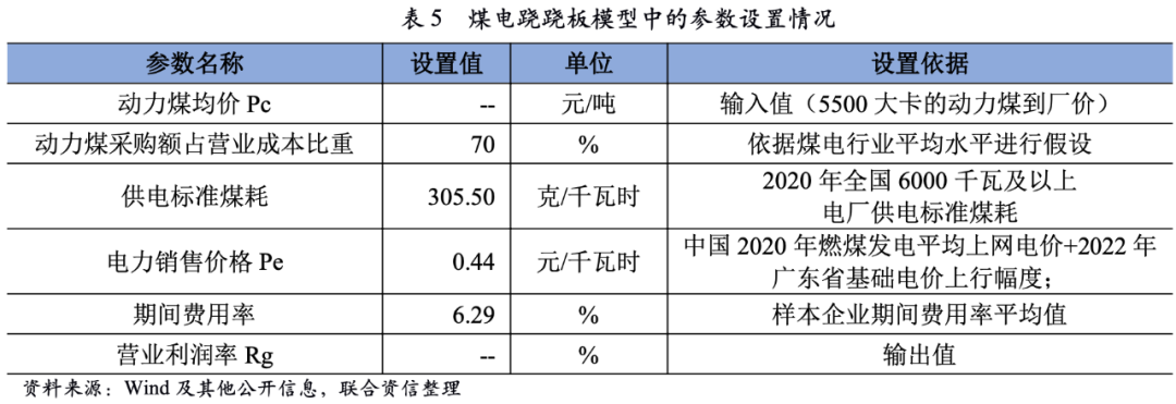 我們同時建立了模型對煤電企業(yè)的煤價盈虧平衡點進(jìn)行測算得出,煤電企業(yè)營業(yè)利潤率為0%的動力煤(5500大卡)到廠均價為760元/噸左右,同時考慮到由于港口到電廠還有一定的運(yùn)輸距離以及運(yùn)輸費用,假設(shè)動力煤到廠價與港口價的價格差異為60元/噸左右,電廠的盈虧平衡點港口價為700元/噸左右。相關(guān)測算方法參見聯(lián)合資信研究報告——《煤電價格中樞與煤電行業(yè)“蹺蹺板”效應(yīng)的研究》[4],此處我們不再贅述,相關(guān)測算假設(shè)如下。