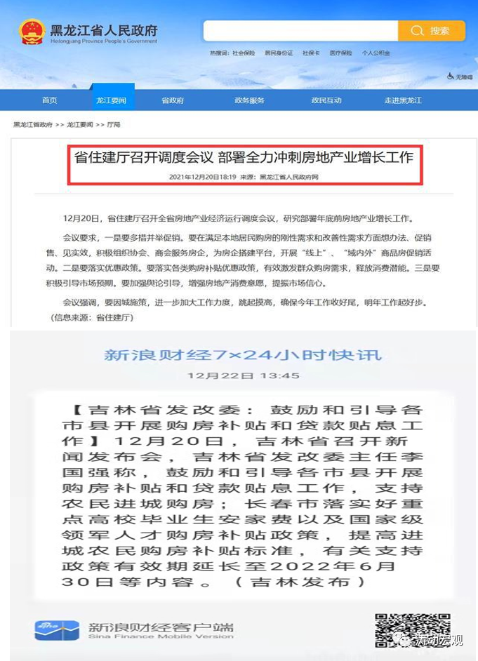 例如,2021年12月20日,黑龍江省政府發(fā)布《省住建廳召開調(diào)度會議部署全力沖刺房地產(chǎn)業(yè)增長工作》(21日這一新聞便官網(wǎng)被撤下),稱黑龍江省住建廳召開全省房地產(chǎn)業(yè)經(jīng)濟(jì)運(yùn)行調(diào)度會議,要求要想辦法促銷售,落實(shí)購房補(bǔ)貼政策,提振市場信心。