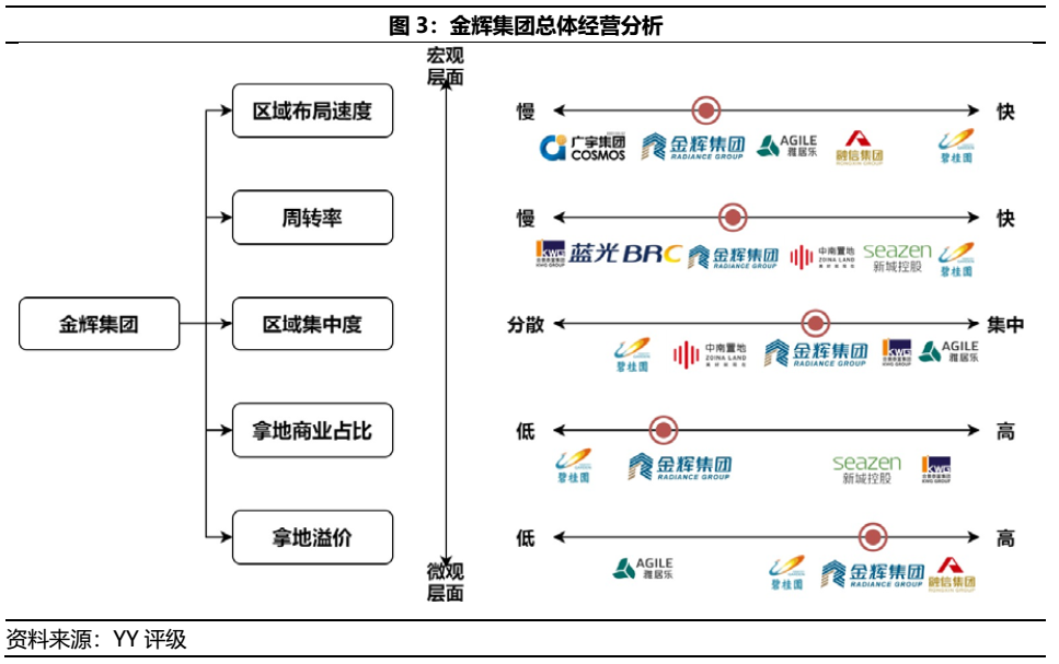 金輝集團的經營指標包括周轉率/區(qū)域集中度/綜合拿地占比表現均較為中庸(如圖3),但高價/溢價拿地情形較為普遍,疊加不具備投資性物業(yè)運營優(yōu)勢,短期或面臨利潤遭壓縮的壓力,中長期亦面臨成本端上升造成的利潤擠壓。