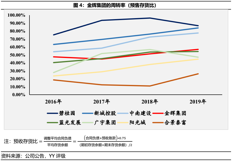 金輝集團在經營層面周轉率指標表現中庸,雖無法企及碧桂園的周轉率,但仍在行業(yè)標準水平。
