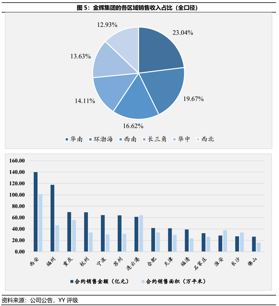 區(qū)域收入層面來看,或由于金輝集團起家于福建所致,華南區(qū)域占比較高,占23.04%。但作為閩系房企,金輝集團并沒有呈現如大多民營房企般的區(qū)域集中問題,金輝的區(qū)域性布局整體較為分散。此外,受到金輝集團全國化布局,并著眼于土地價格水平較低城市進行布局所致,西安區(qū)域貢獻收入為集團首位,高于大本營福州區(qū)域。