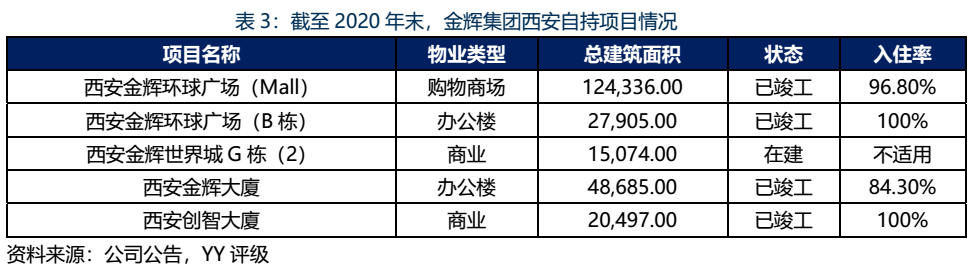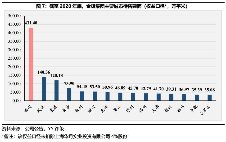 自各城市待售建面(權益口徑)統(tǒng)計可見,除了西安區(qū)域待售建面遠超于各城市,其余城市的待售建面較為平均。金輝集團的重倉西安策略或與集團為了解決土地成本問題有關,除了一般的住宅和公寓產品外,金輝集團的西安區(qū)域業(yè)態(tài)亦存在較多的持有型物業(yè),致使截至20年末待銷售建面達431.40萬平米,約等于20多個中型樓盤。