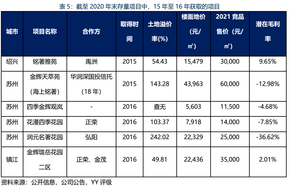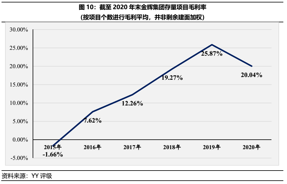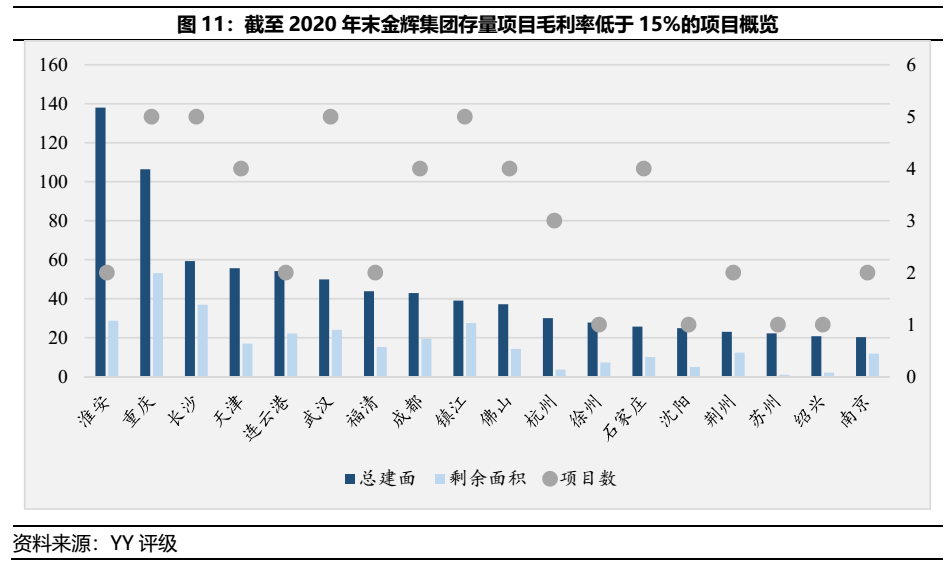 根據圖9對金輝集團截至20年末存量項目進行毛利率測算,并依照拿地時間進行排序,可發(fā)現自15至17年間存量項目毛利率僅為-1.66%、7.62%和12.26%,屬于第一波利潤壓縮期間,該問題始于金輝集團自身高溢價拿地造成。而20年新獲取的項目則為20.04%,將面臨第二波利潤壓縮。