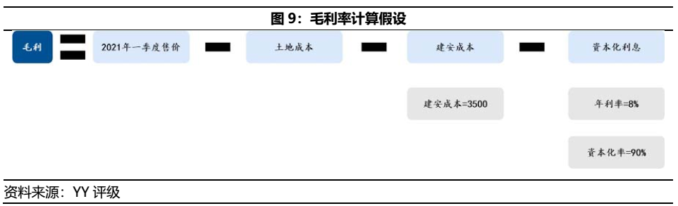 利用簡要的毛利率測算(如圖9),結合2021年一季度項目/競品售價、土地獲取成本、建安成本(含銷管成本)和資本化利息等要素,對金輝集團存量儲備項目中的近5年間獲取項目進行毛利率估算。