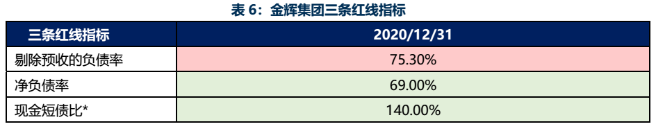 雖曾頻繁高溢價拿地,但相比于其他閩系的激進擴張,金輝集團的布局節(jié)奏顯然緩和許多,致使財務壓力較輕。截至2020年末,公司三條紅線僅踩1條,為黃檔。