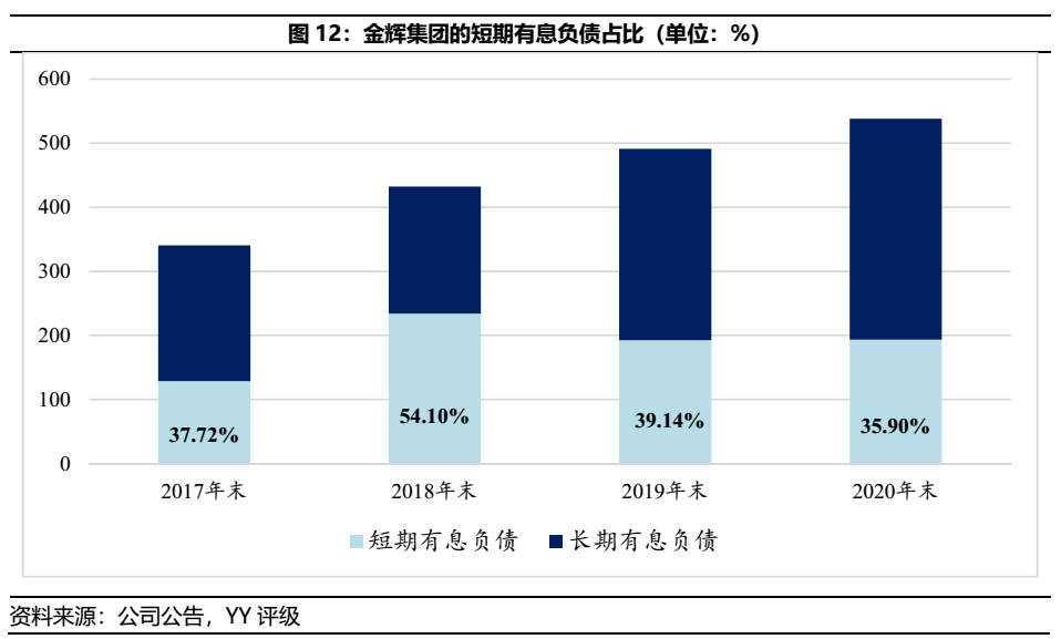 然而,如大多數民營房企,盡管金輝集團的表內資金鏈壓力尚可,但缺乏國資背景的股東劣勢致使短債常年居高不下。近4年的短債占有息負債比例均高于35%,未來或仍難以有效利用長債置換短債。