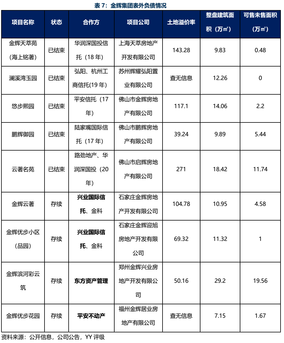 根據項目公司與樓盤名比對參考,羅列如表7的表外負債可見,金輝集團的存續(xù)表外負債情況較少,多為已結束的前融資金。然而,也可見個別的土地溢價率發(fā)現,非標資金多參與了高單價地塊的投資,因此后續(xù)仍需關注金輝集團選擇的投資運營模式,跟蹤其招拍掛溢價情形,關注隨著高溢價拿地而來的表外負債。