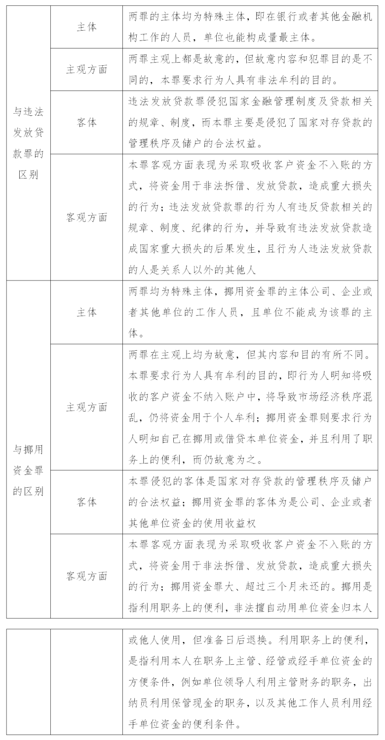 本罪客觀方面表現(xiàn)為采取吸收客戶資金不入賬的方式,將資金用于非法拆借、發(fā)放貸款,造成重大損失的行為。“吸收客戶資金不入賬”,是指不記入金融機構(gòu)的法定存款賬目,以逃避國家金融監(jiān)管,至于是否記入法定賬目以外設(shè)立的賬目不影響該罪成立。“非法拆借、發(fā)放貸款”,是指將沒有入賬的資金挪借給其他單位,或者將沒有入賬的資金作為貸款發(fā)放其他單位或個人。