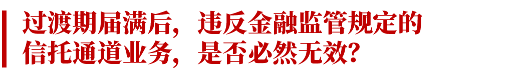《九民紀(jì)要》第93條對(duì)通道業(yè)務(wù)的含義、效力,《資管新規(guī)》過渡期安排等進(jìn)行了明確。目前《資管新規(guī)》過渡期已延長(zhǎng)至2021年底。基于《九民紀(jì)要》的規(guī)定,在過渡期內(nèi)的通道業(yè)務(wù),如果不存在其他無(wú)效事由的,將被認(rèn)定為有效。那么,根據(jù)該條規(guī)定,是否可以得出過渡期之后的通道業(yè)務(wù),將必然被認(rèn)定為無(wú)效的結(jié)論。