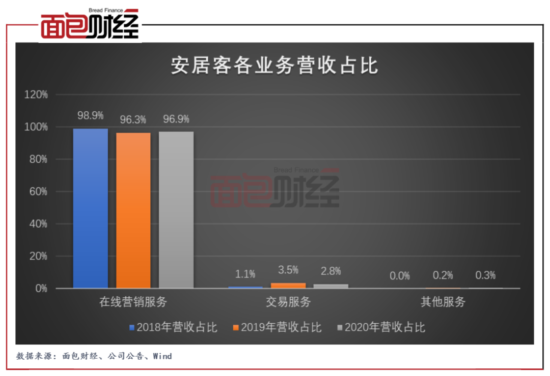 交易服務(wù)則主要來自于從開發(fā)商賺取的新盤銷售傭金,2020年貢獻收入2.28億元,營收占比2.8%。可以看到,安居客的營收高度依賴于在線營銷服務(wù)。