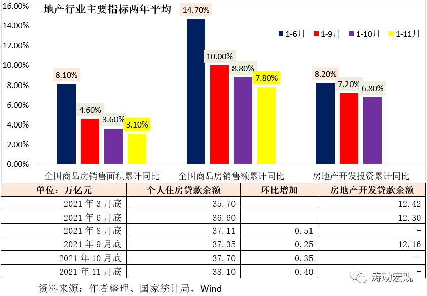 具體看,今年6-10月,房地產(chǎn)開發(fā)投資累計同比增速的兩年平均值分別為8.20%、8%、7.7%、7.2%和6.8%。今年6-11月,全國商品房銷售面積累計同比增速的兩年平均值分別為8.1%、10.25%、7.68%、4.60%、3.60%和3.10%,全國商品房銷售額同比增速的兩年平均值分別為14.70%、14.33%、10.82%、10%、8.8%和7.80%,顯然無論是地產(chǎn)開發(fā)投資,還是商品房銷售,均呈現(xiàn)出明顯下行態(tài)勢。