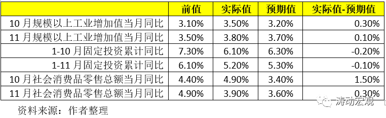 2、11月的工業(yè)生產(chǎn)與消費實際值較預期值亦呈現(xiàn)改善態(tài)勢。具體看,11月規(guī)模以上工業(yè)增加值當月同比增速為3.80%、較預期值高出0.10個百分點,11月社會消費品零售總額當月同比增速為3.90%、較預期值高出0.30個百分點。