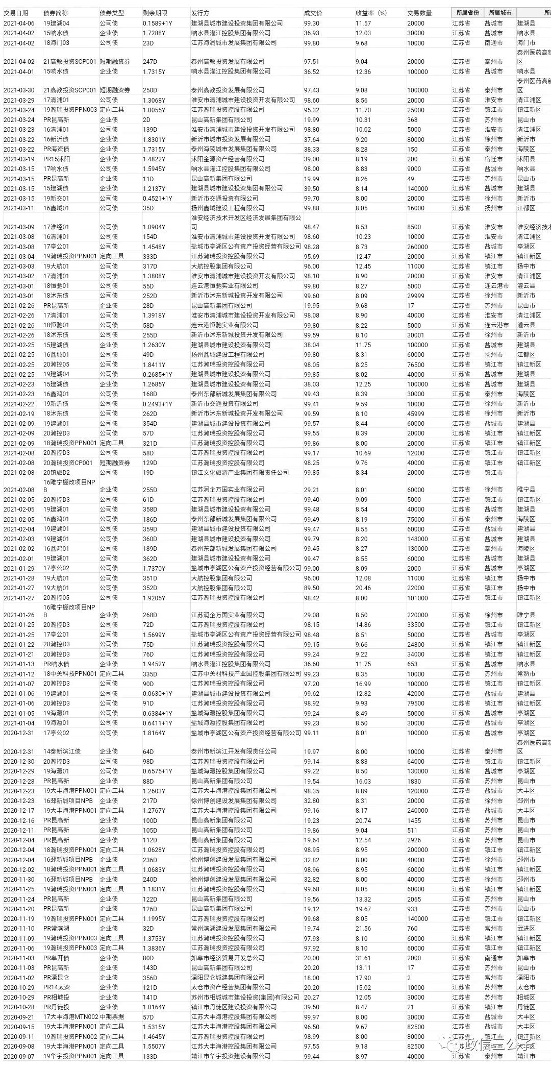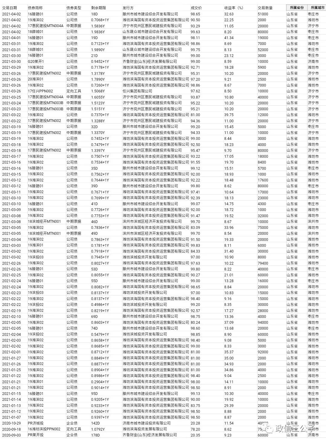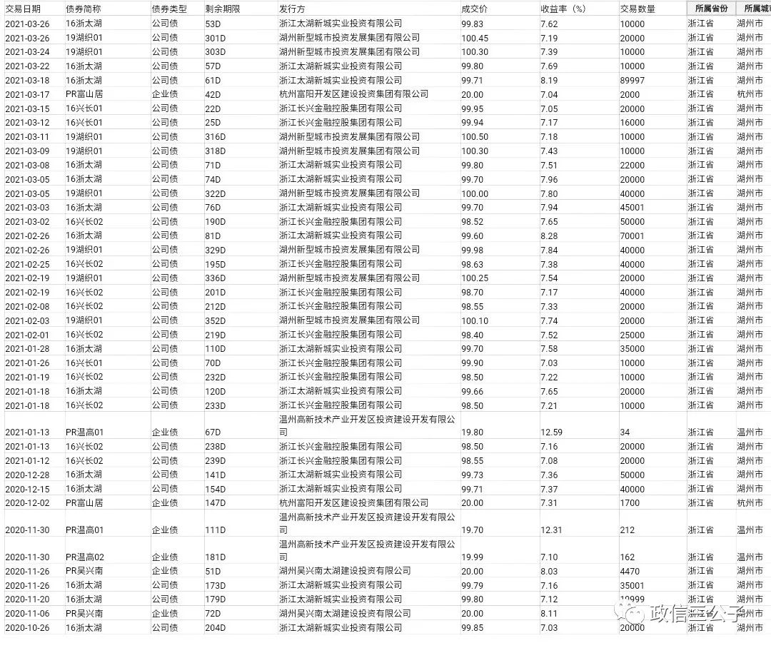整理了一下過去半年內(nèi),到期日在2年以內(nèi)的二級(jí)市場(chǎng)收益高于8%的江浙魯城投的成交信息,分享給大家。