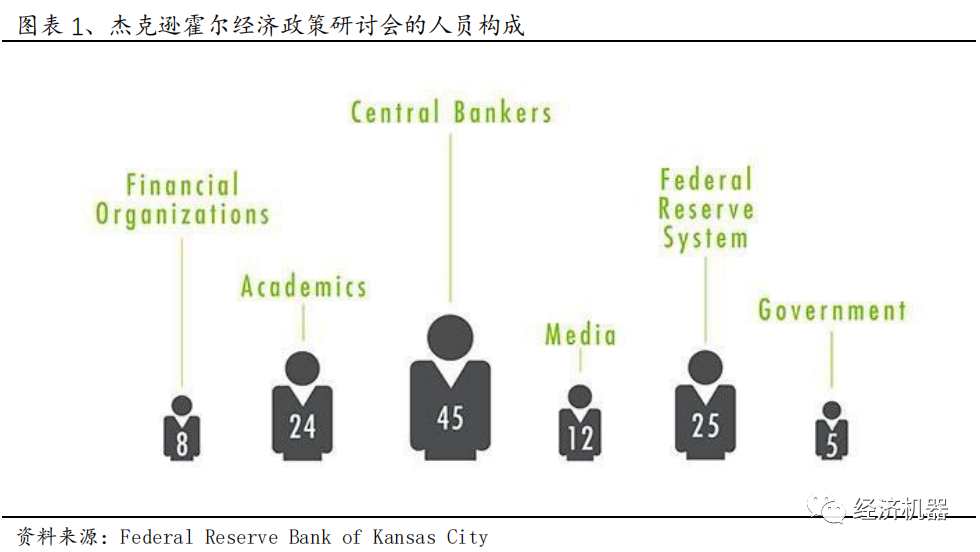 1978年開始,堪薩斯聯(lián)儲(chǔ)在堪薩斯召開了一系列經(jīng)濟(jì)研討會(huì),話題相當(dāng)廣泛,比如起初四次是關(guān)于農(nóng)業(yè)問題的,因?yàn)楫?dāng)時(shí)農(nóng)業(yè)問題很重要。1982年起,話題開始轉(zhuǎn)向了經(jīng)濟(jì)和貨幣政策,并把地點(diǎn)固定在了堪薩斯州的一個(gè)山谷:杰克遜·豪爾,即杰克遜·霍爾經(jīng)濟(jì)政策研討會(huì)。這個(gè)會(huì)議是世界上歷史最悠久的中央銀行會(huì)議之一。研討會(huì)匯集了來自70個(gè)國(guó)家的經(jīng)濟(jì)學(xué)家、金融市場(chǎng)參與者、學(xué)者、美國(guó)政府代表和新聞媒體,總計(jì)約120人,討論共同關(guān)心的長(zhǎng)期政策問題(圖表1)。